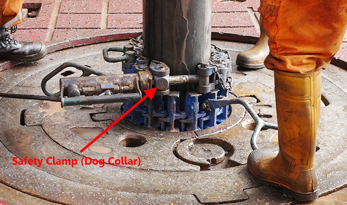 When using drill collars and other tubulars that do not have an elevator shoulder, a safety clamp (dog collar) is installed above the slips. If the gripping elements on the slips fail, the drill collar would slide down. Before the collars can slide all of the way out of the slips into a well, the safety clamp would hold the collars against the top of the slips.
