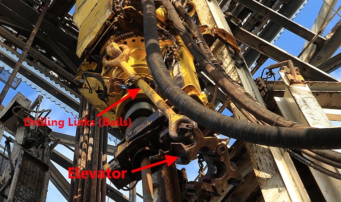 The elevator is used to latch around the top of pipe joints in the drill string. Once latched, the driller can raise and lower pipe in and out of the hole. Rig crews attach the elevator to the hook or Top Drive with two forged high-grade steel rods called links or bails. One end of the link fits into the link ears on the hook or Top Drive. Link locking arms secure the links into the ears. Crew members then attach the elevator to the other end of the links. Most elevators are hinged and rig crews open and close them by operating the latch with two handles on each side.