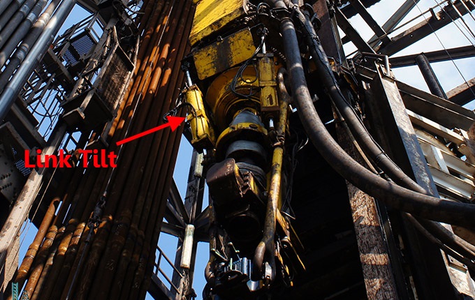 For a top drive system, the links holding the elevator have an air operated or pneumatic tilt mechanism (Figure 9). The driller activates the tilt mechanism when the pipe is being pulled from the hole. When the top of the drill string reaches the derrick man’s position at the monkey board, the driller can tilt the top of the stand of the pipe toward the derrick man. The derrick man can then unlatch the elevator and set the stand back in the fingerboard.